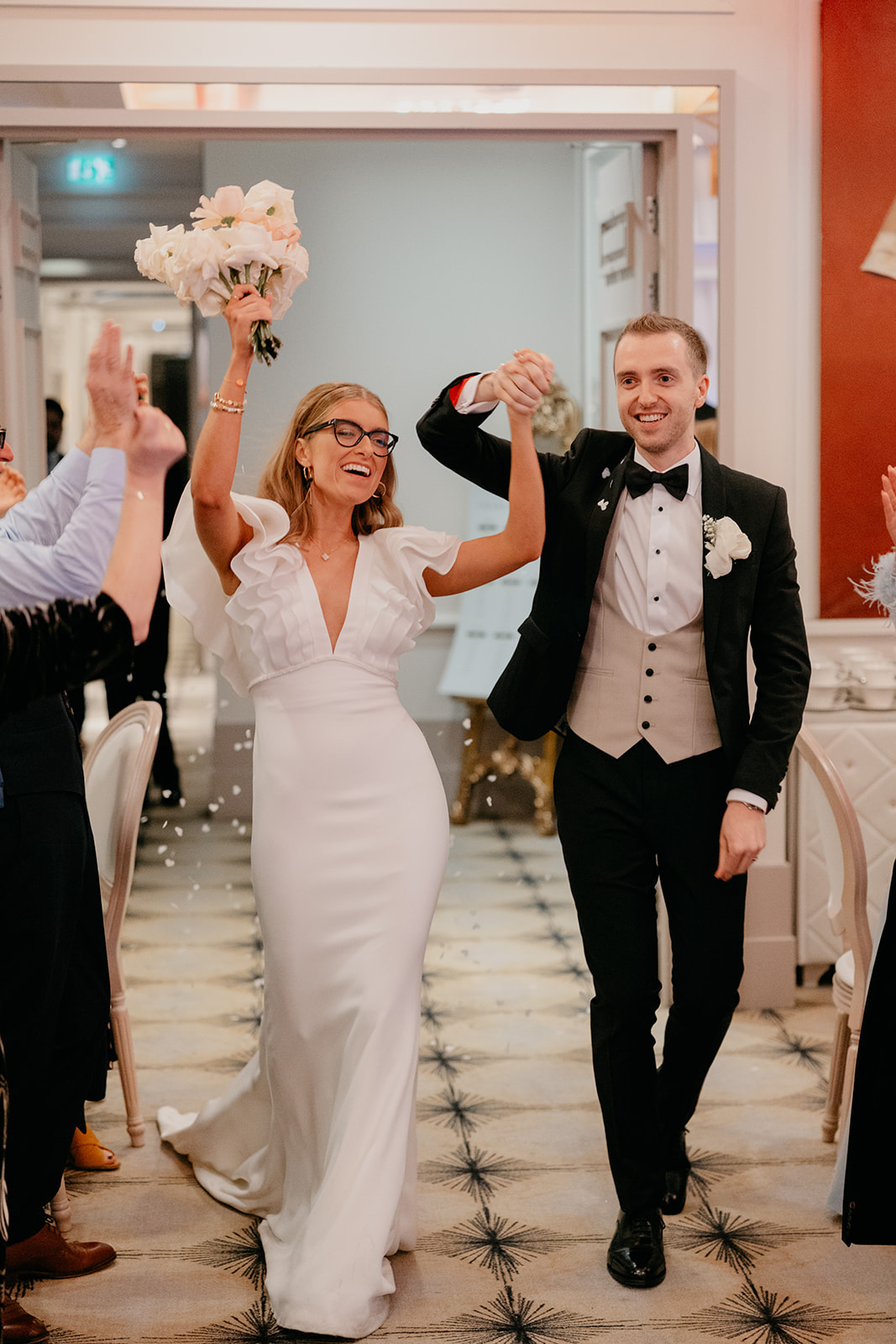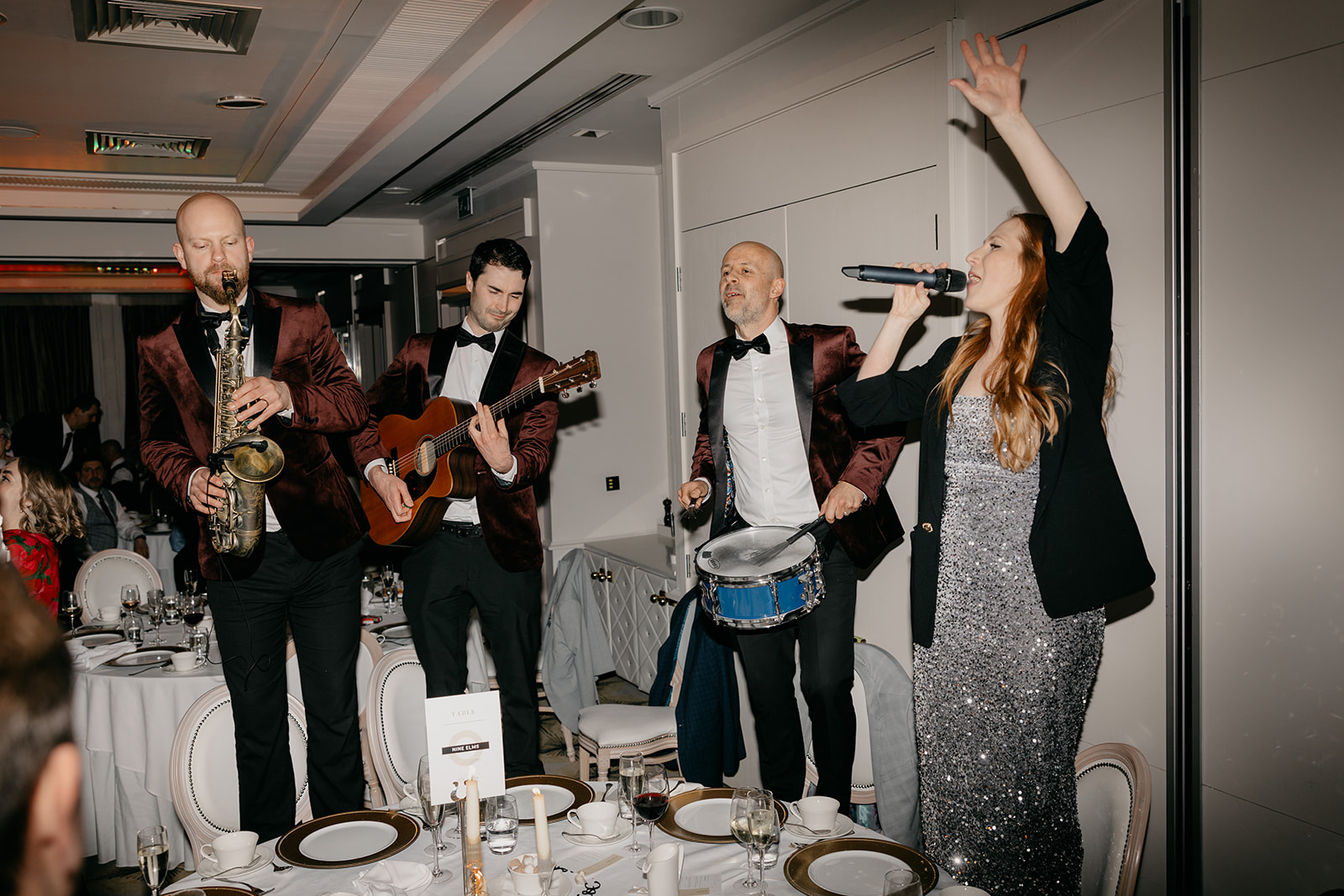 We flew to Belfast on Saturday morning to set up and get ready to welcome guests to the drinks reception. They had decided to keep the band a surprise from the guests. We greeted guests at the door of The Dark Horse in Belfast, a really unique and stylish pub with decor that resembles the 1920s. The atmosphere was super fun and energectic and people were singing along as they walked through the door. We performed two sets at the bar before heading over to The Merhcant hotel to set up for the wedding breakfast.